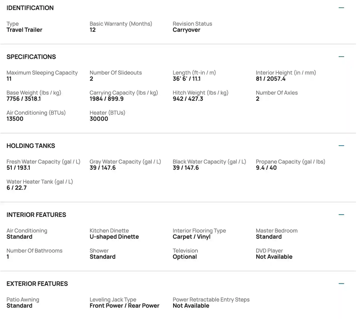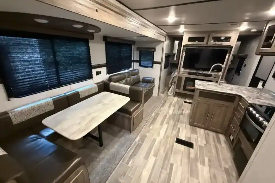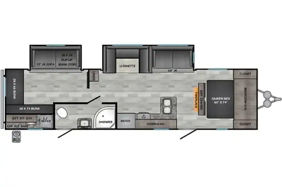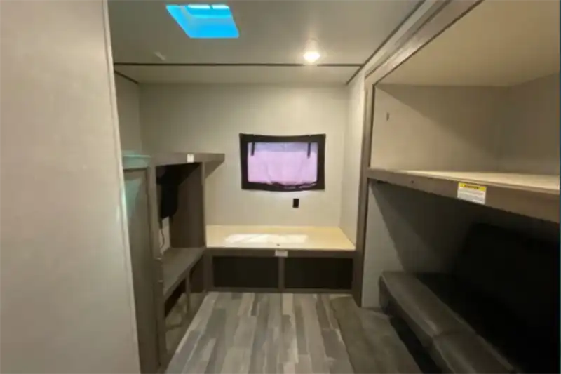 Home/Trailers/2021 CrossRoads Zinger 328SB2021 CrossRoads Zinger 328SBAvailableTravel TrailerPhoto GalleryDescription:Two bedroom travel trailer with rear triple bunk room, front master bedroom with queen bed, banquette table, tv & fireplace, and outdoor kitchen area. Some repairs needed. Specifications